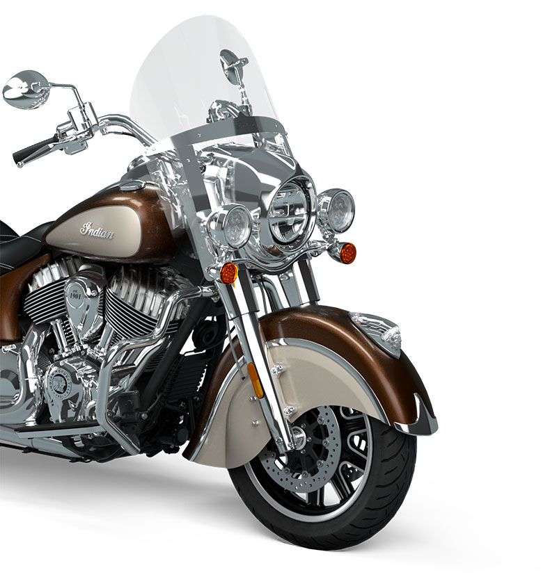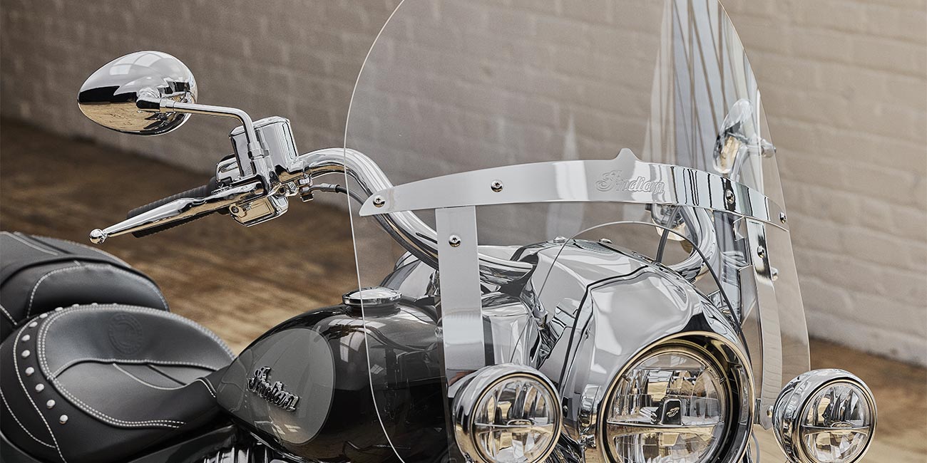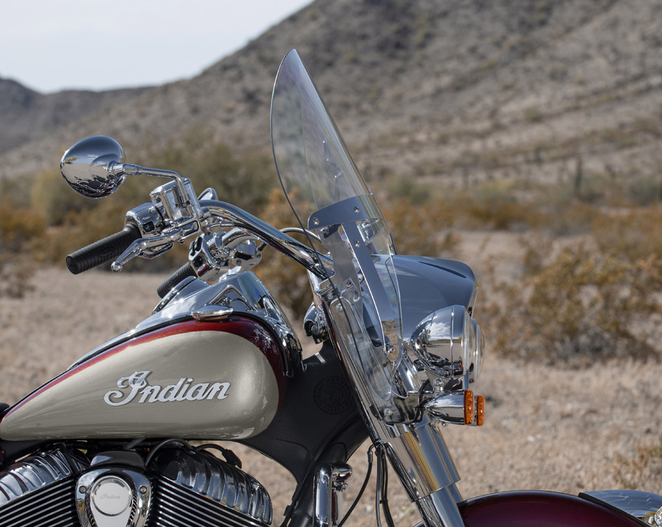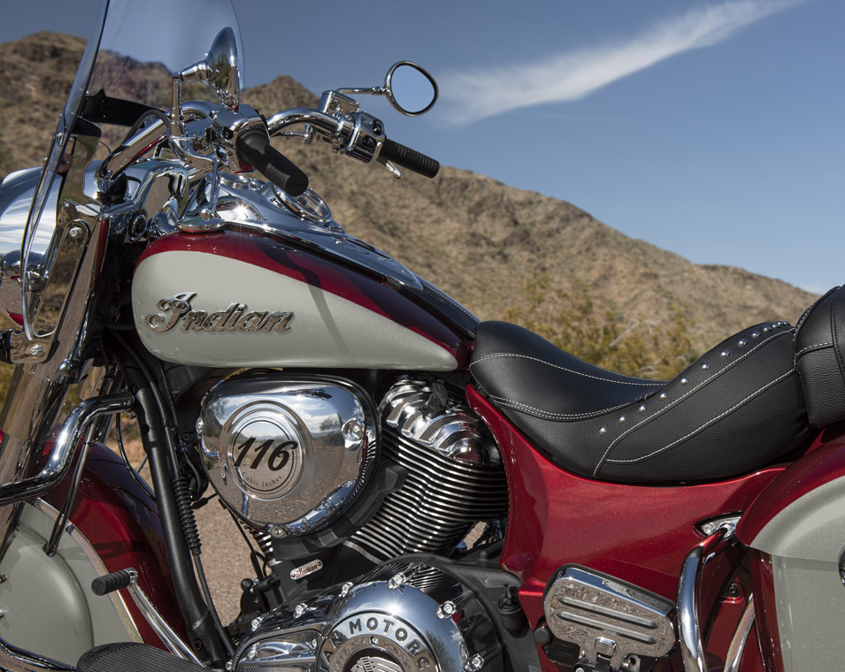 クイックリリース・ウインドシールド、リモートロック式ハードサドルバッグ、ハイウェイバー、ライドモード、ABS、クルーズコントロール、キーレスイグニッション、インディアン®スクリプトタンクバッジ、12V充電ポート